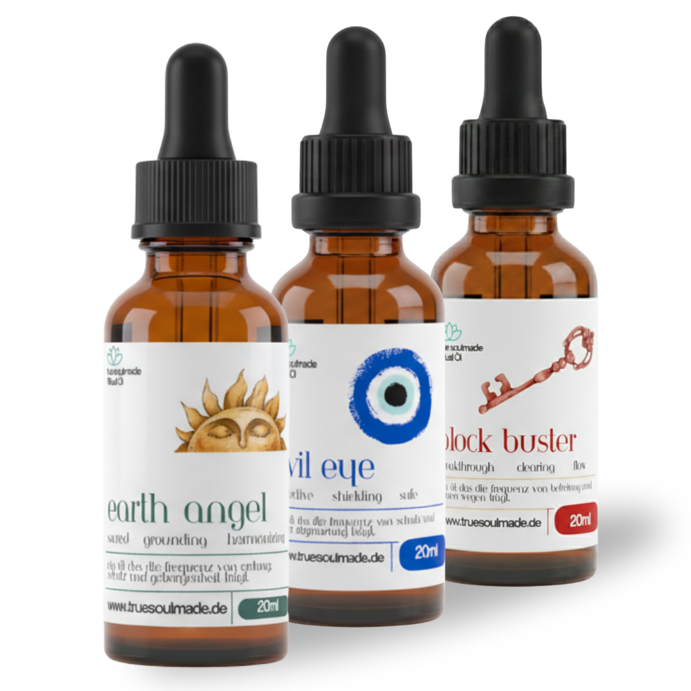 Unsere Öle bestehen aus einer Mischung aus natürlichen Ölen, Kräutern und ätherischen Bestandteilen, die wir in liebevoller Handarbeit ansetzen und energetisch aktivieren. Als Trägeröl verwenden wir Mandelöl. Da jede Mischung Teil unseres eigenen Ritualprozesses ist, geben wir die genauen Zusammensetzungen nicht im Detail weiter. Alle Öle sind frei von synthetischen Duft-, Farb- oder Konservierungsstoffen und dienen ausschließlich energetischen und rituellen Zwecken – nicht als Kosmetik oder medizinisches Produkt.